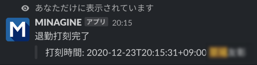 例:出勤開始する場合「/minagine in」 Slackのチャンネル画面