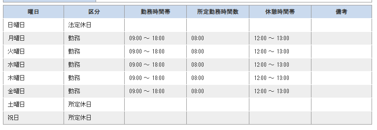 就業時間の設定で登録した「所定休日」「法定休日」で全て勤務が発生している時に、